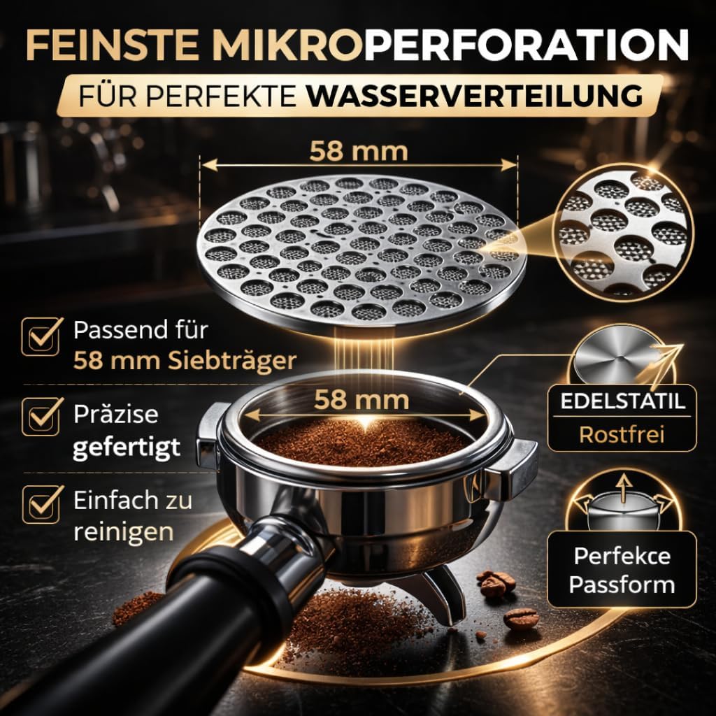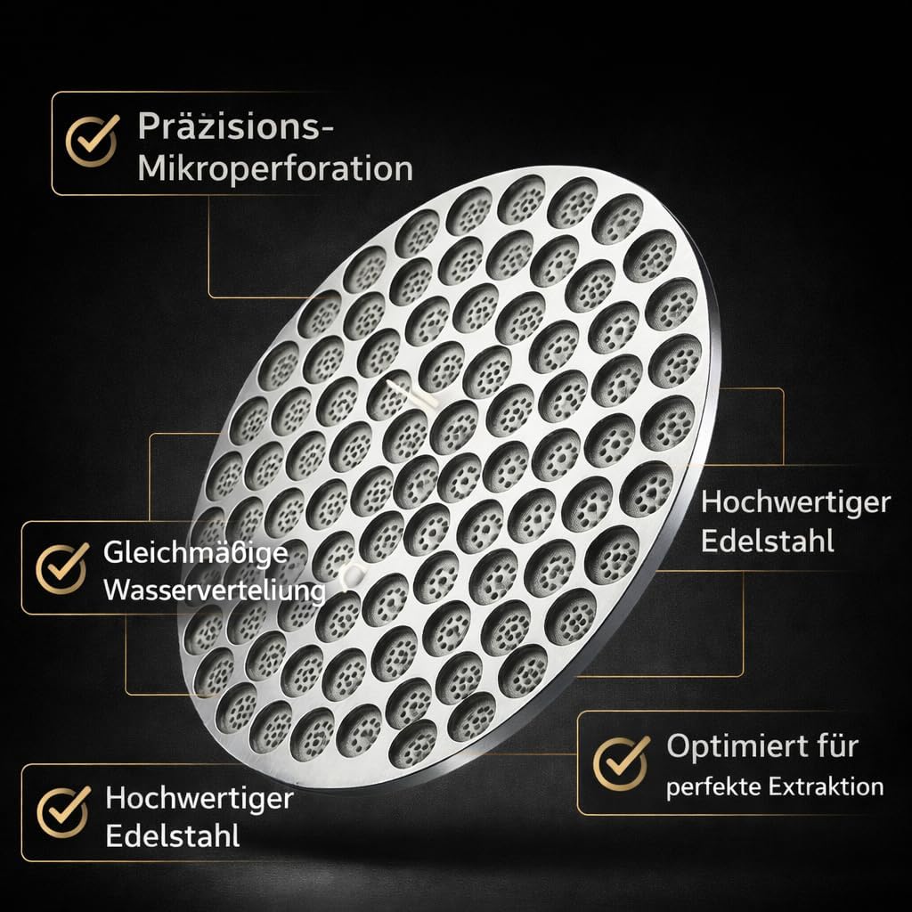 - ✅ INTELLIGENTE LOCHSTRUKTUR: Die 1,7 mm starke Filterplatte mit feiner Lochung optimiert den Wasserfluss und sorgt für stabile Brühprofile – jede Tasse Espresso wird reproduzierbar und balanciert.